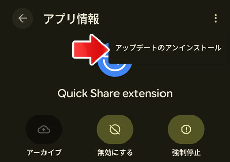 右上の「︙」ボタンをタップして、アップデートのアンインストールを選択します。
