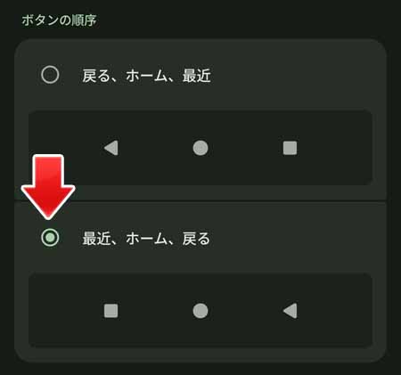 ボタンの順序から「最近、ホーム、戻る」を選択します。